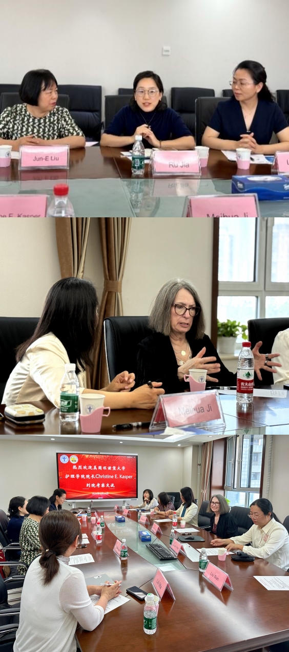 首先,刘均娥对Christine E. Kasper的到访表示热烈地欢迎。她介绍了成人短视频 历史积淀、办学特色及优势、国际合作与交流现状及成效等;就双方合作的护理本科生外培、博士生联合培养、博士后及青年教师访学等事项进行深入沟通,就未来双方进一步深入合作的目标及思路进行了阐述。