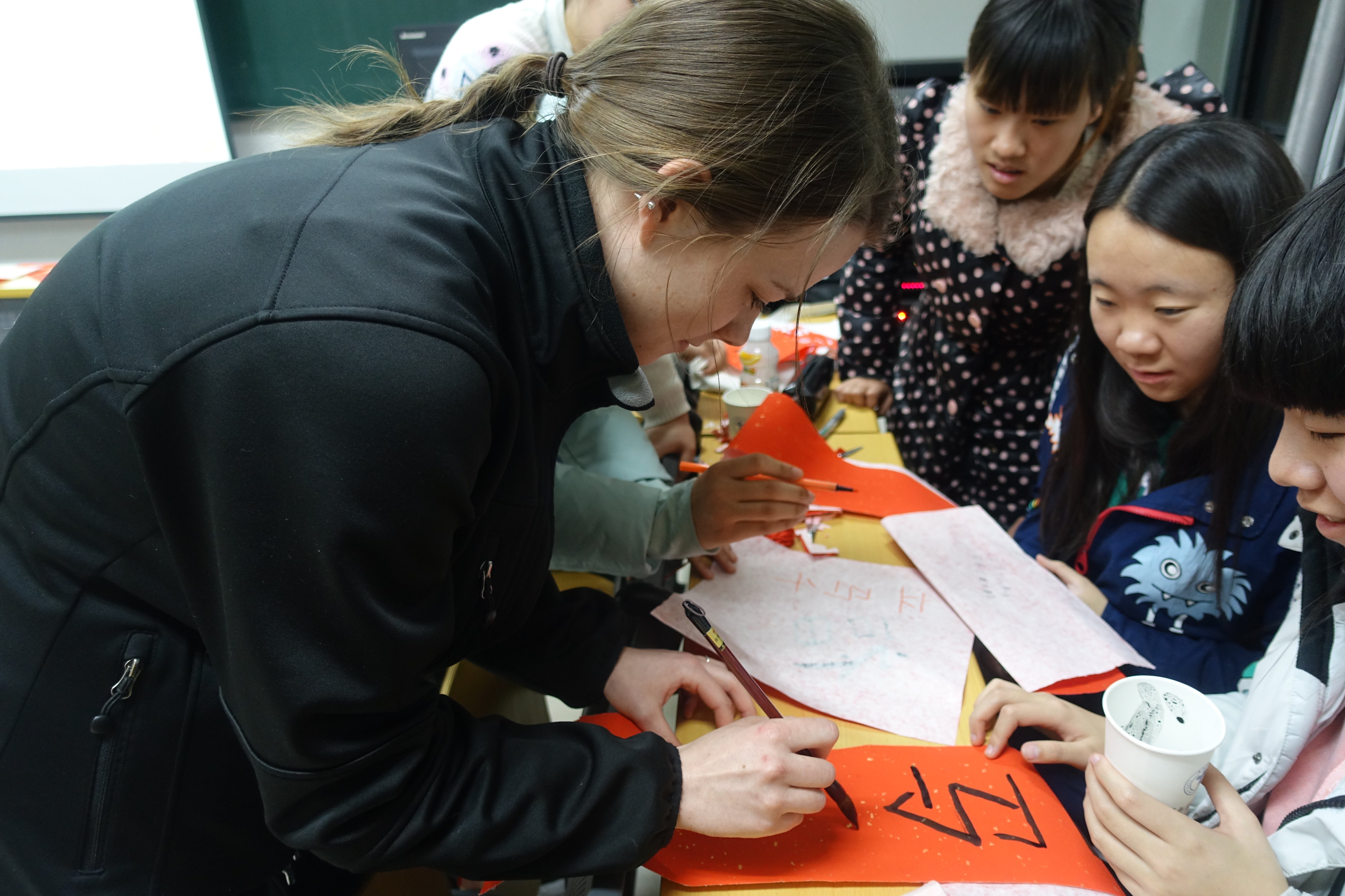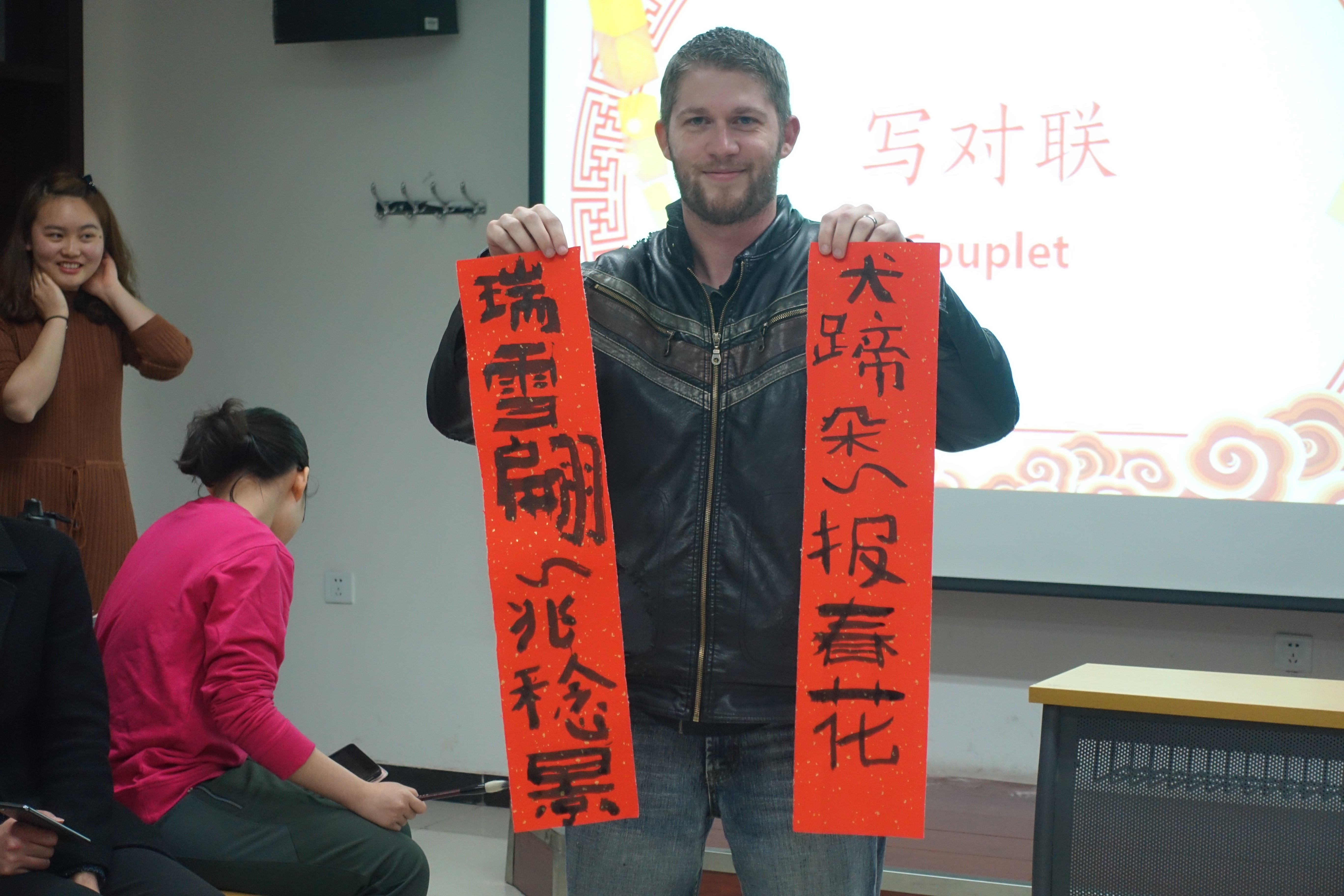 本次活动共分为四个模块——“小组交流”,“剪窗花”,“写对联”,“编织中国结”。首先,两国学生自由交流讨论各国传统节日特色,现场气氛轻松活跃。在“剪窗花、写对联、编织中国结”环节中,除了向交流生介绍了它们的历史和意义,我们还准备用物让交流生能够亲自动手。通过这样的互动环节,一方面促进了同学们之间的情感交流,另一方面也使得同学们对中西文化差异更加了解。